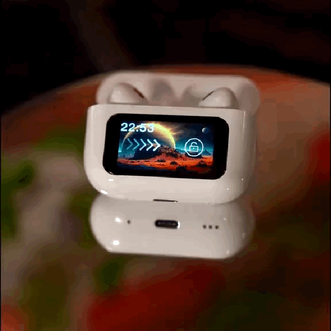 EarPods with a display feature a built-in screen on the case, allowing for touch controls, notifications, and quick access to settings.